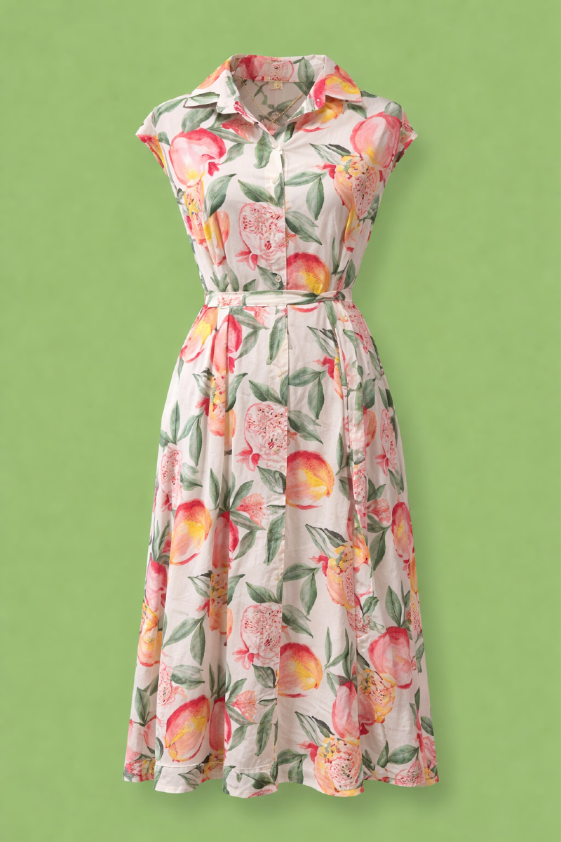 Ärmlös skjortklänning i ett tropiskt mönster.